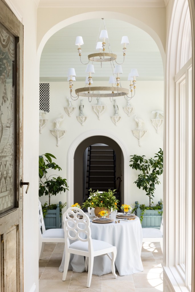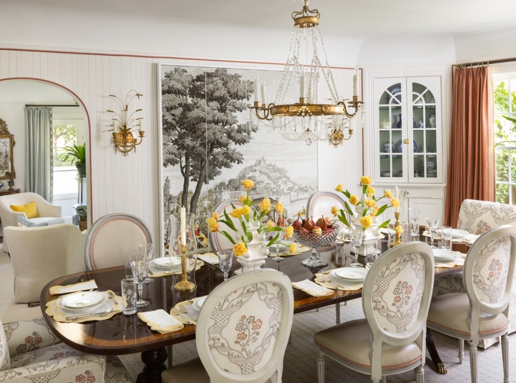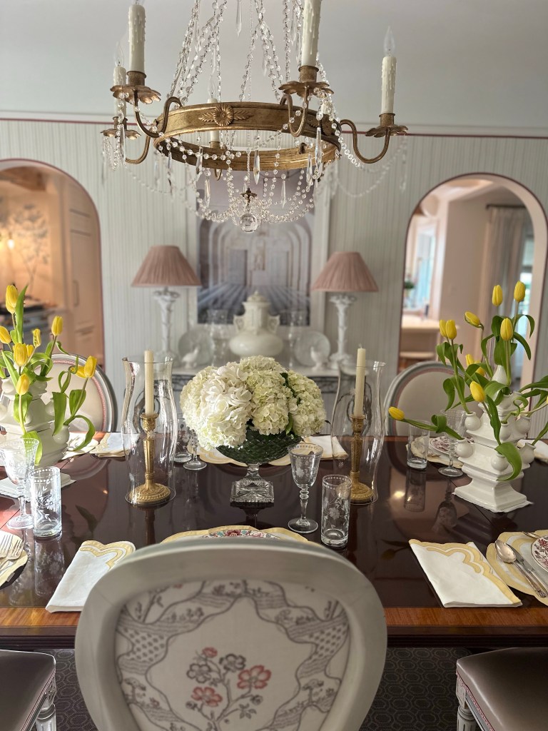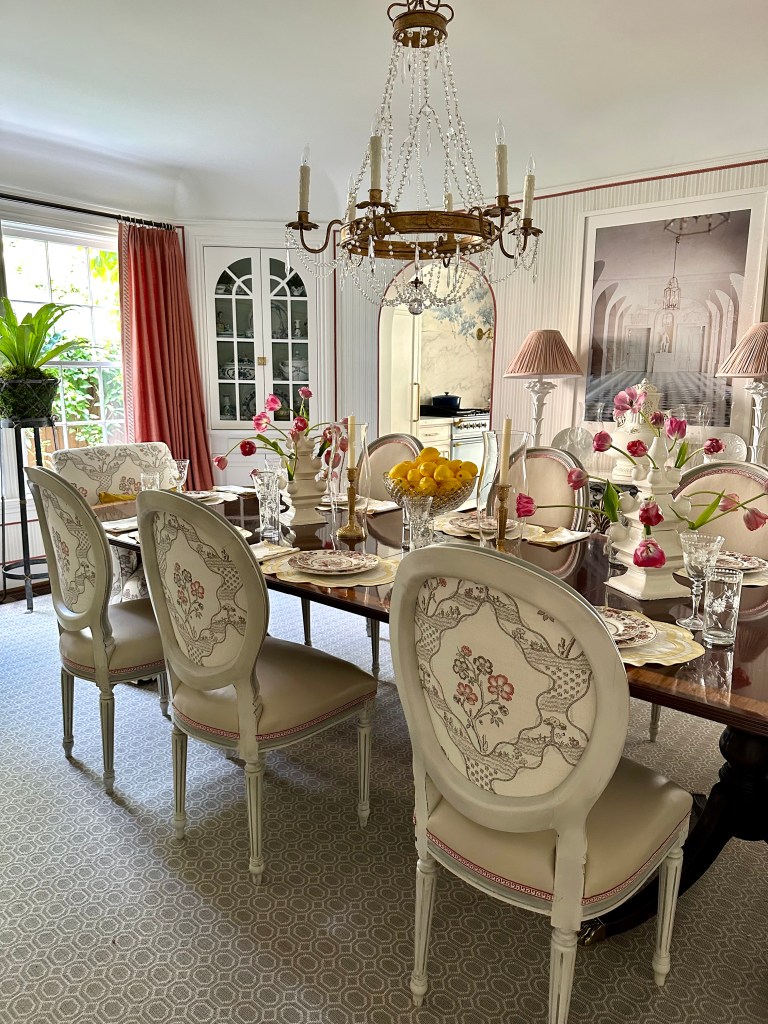 The antique table and chairs were sourced locally. Pickering House Interiors oversaw reupholstering the antique chairs and sourcing other interior selections, including, the striped wallpaper with ribbon trim.