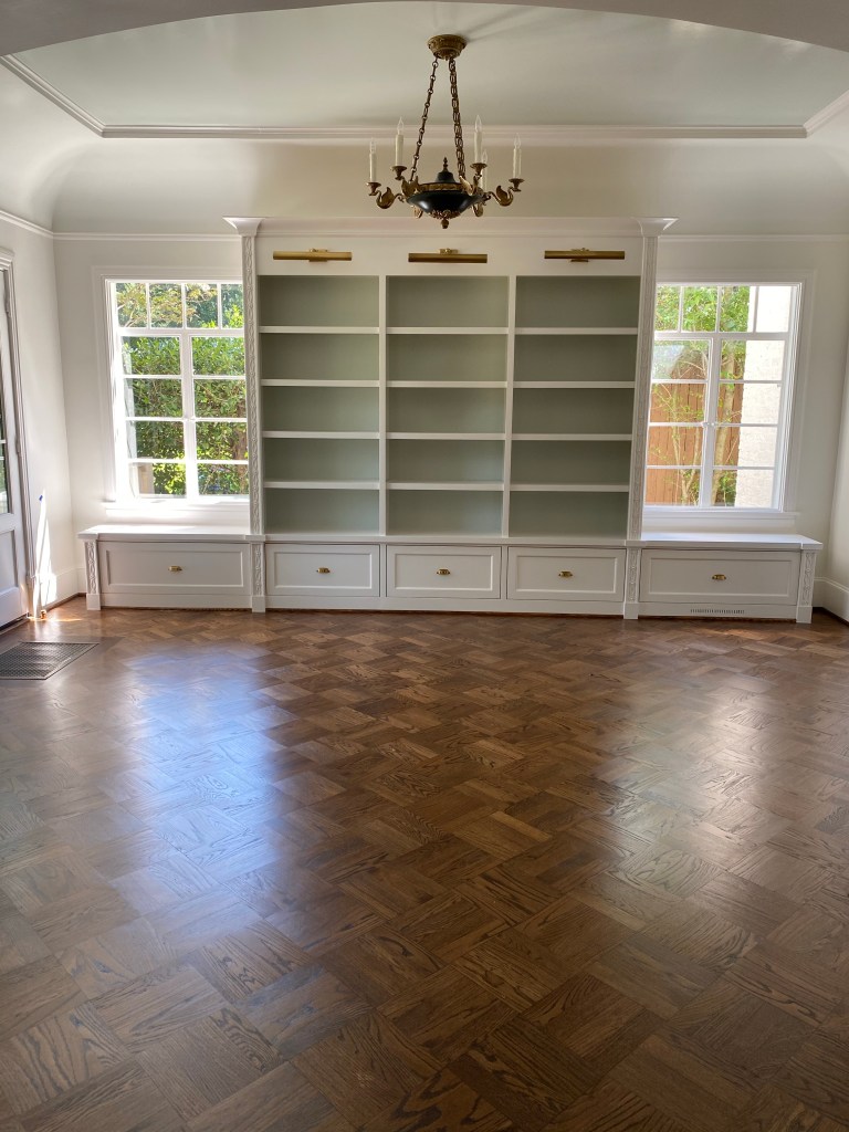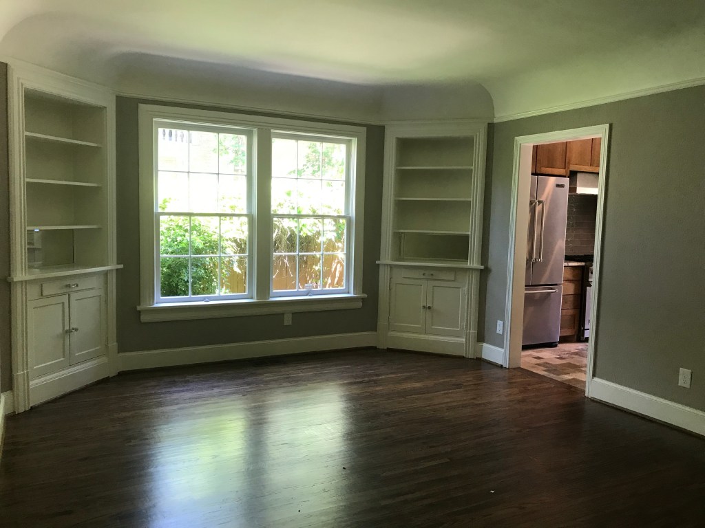 - The bookshelves and window seats were added during the renovation, as well as, the French doors leading to the front courtyard.