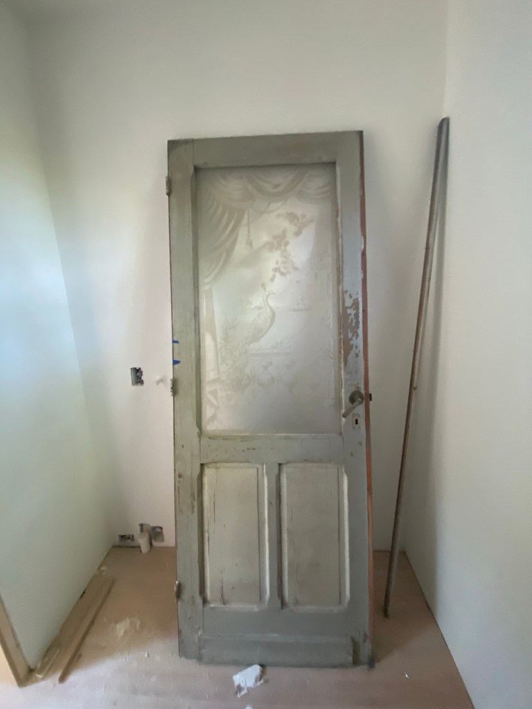 - The antique pantry door is flemish from the 1890s and was found locally at Country Garden Antiques. The original paint remains, as well as, the etched glass.