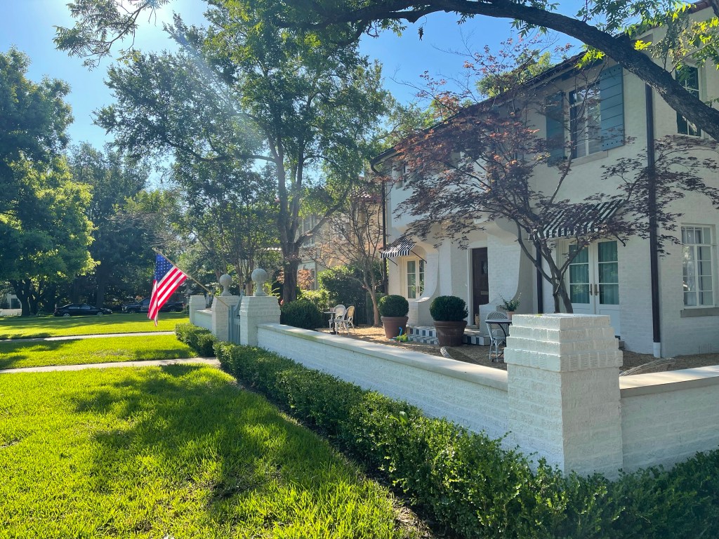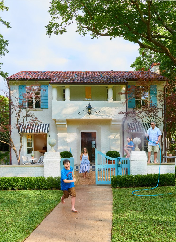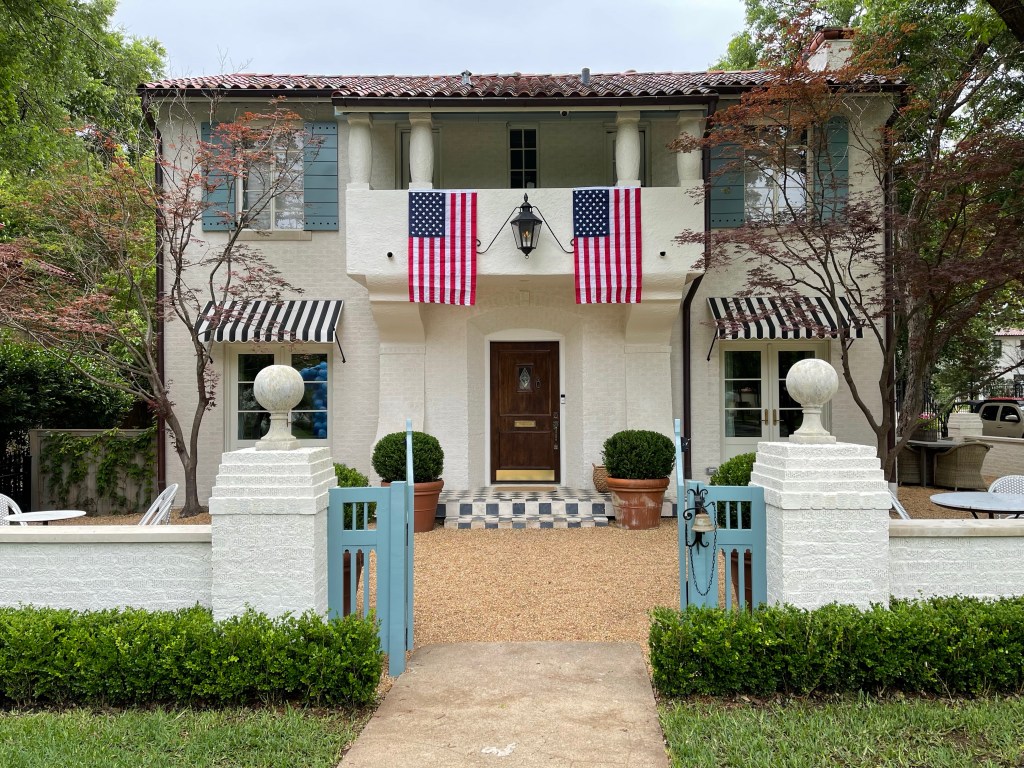 Many of the Hutsell homes on Lakewood Blvd have charming front-facing or side courtyards built into the front elevation. We loved the idea of a courtyard for design aesthetics, entertaining and to have an additional barrier away from a busy street for pets and kids. Since we did not inherit a courtyard with our Hutsell, adding one during the renovation was at the top of our to-do list. The design inspiration for the courtyard was the South of France where you often see pea gravel, large potted boxwoods in clay pots and small bistro tables scattered throughout the gardens. The blue courtyard gate was inspired by one found at the Mas de Poiriers, a large estate in Avignon, and it was fabricated by the Barringer Home’s team. The bell on the side of the blue gate was originally from an Abbey outside of Aix-en-Provence. The black and white tile added to the front porch was also reclaimed from France. The striped awnings and wood shutters were added to honor the original Hutsell front elevation. The plaster balcony is original and believed to be the only cantilevered balcony on a Hutsell designed home.
