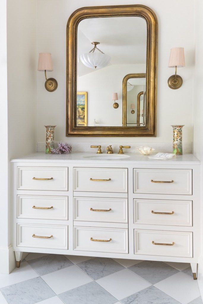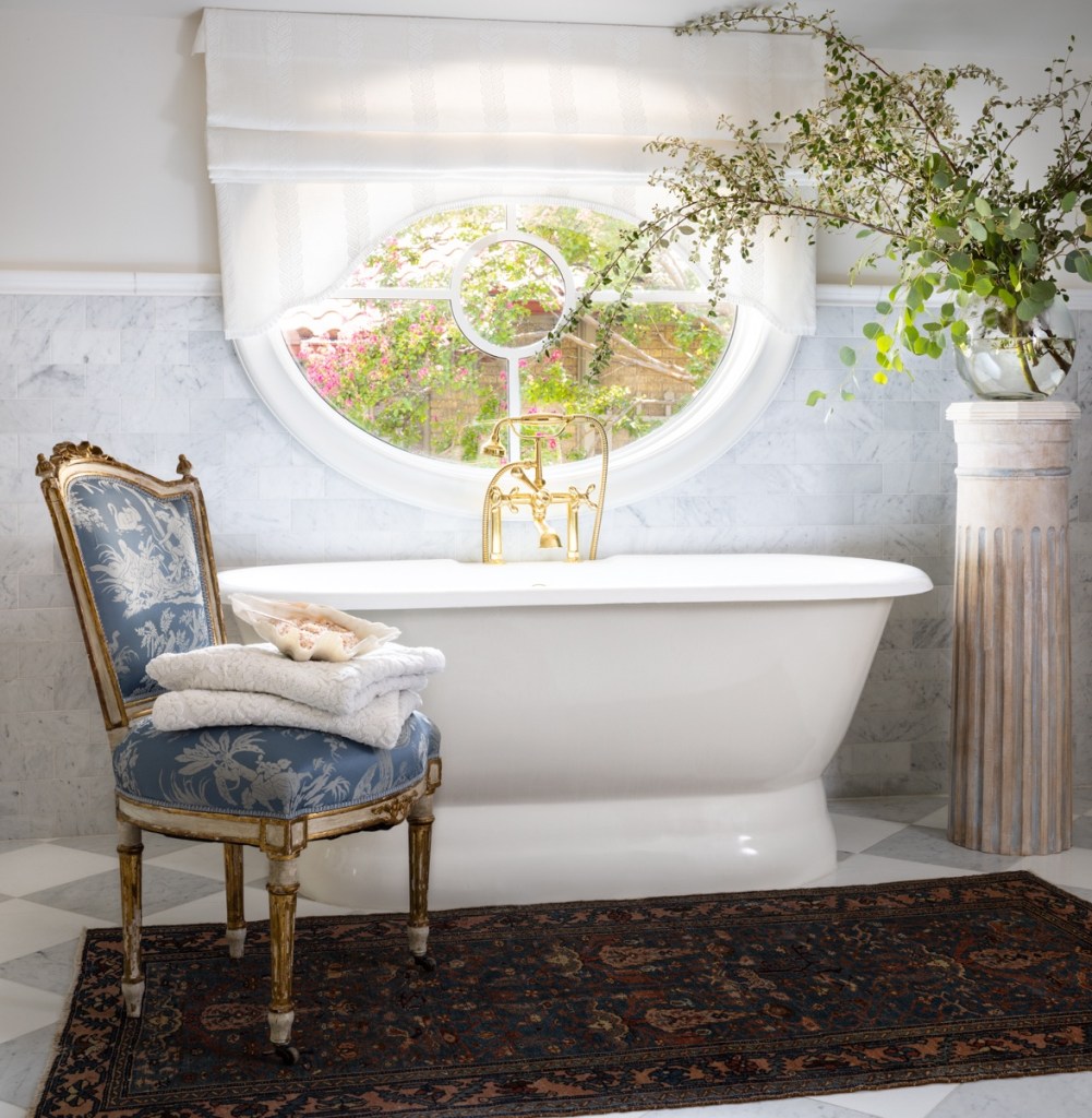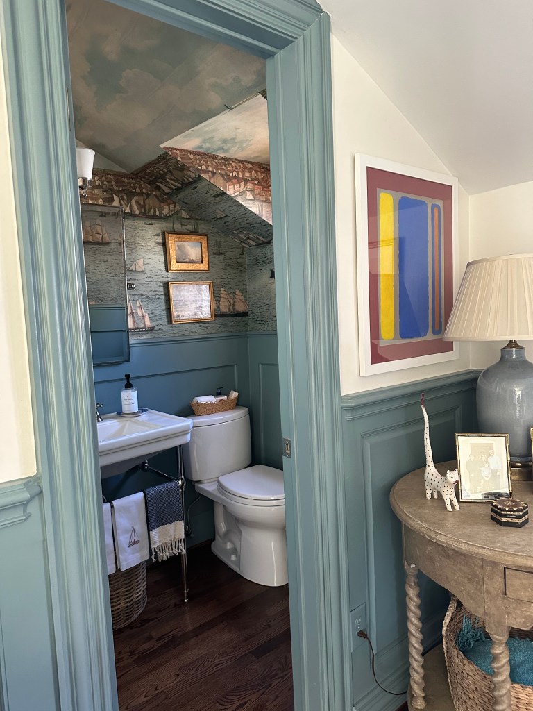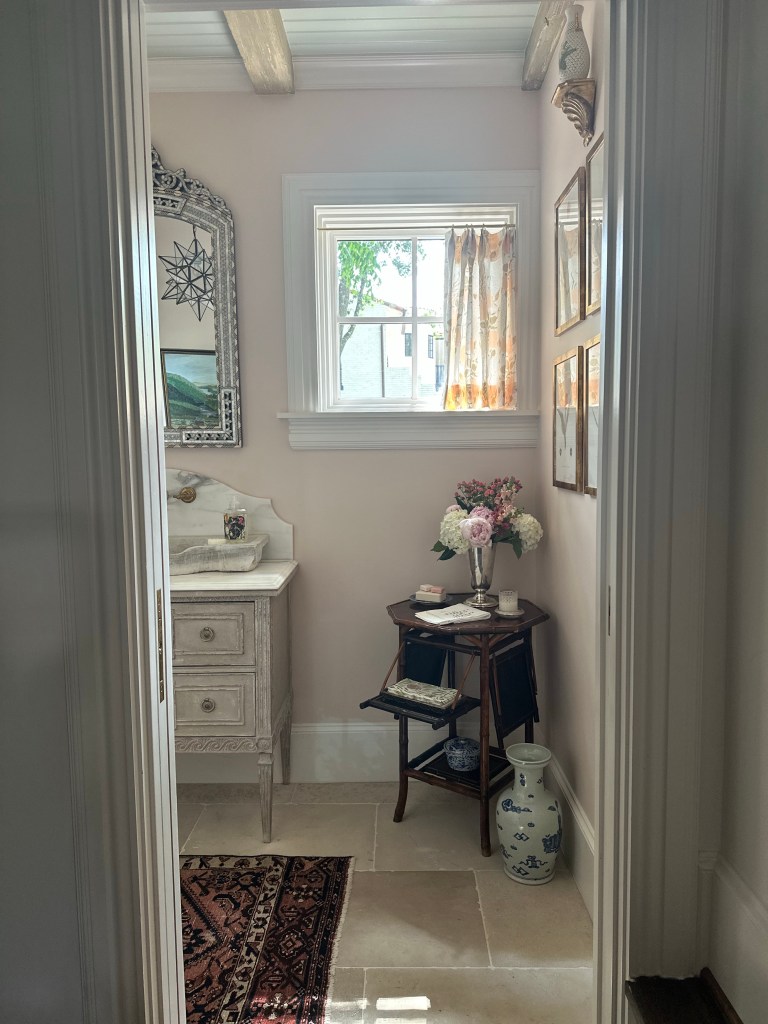 - The oil paintings outside the powder bath were sourced at antique markets in France.