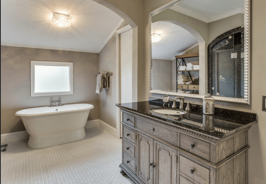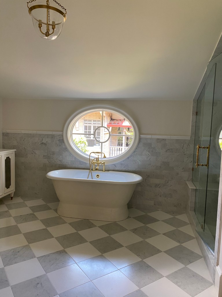 - The primary bathroom was also redesigned by Maestri Studio to include a new water closet and double vanities/sinks, additional storage and a larger window.