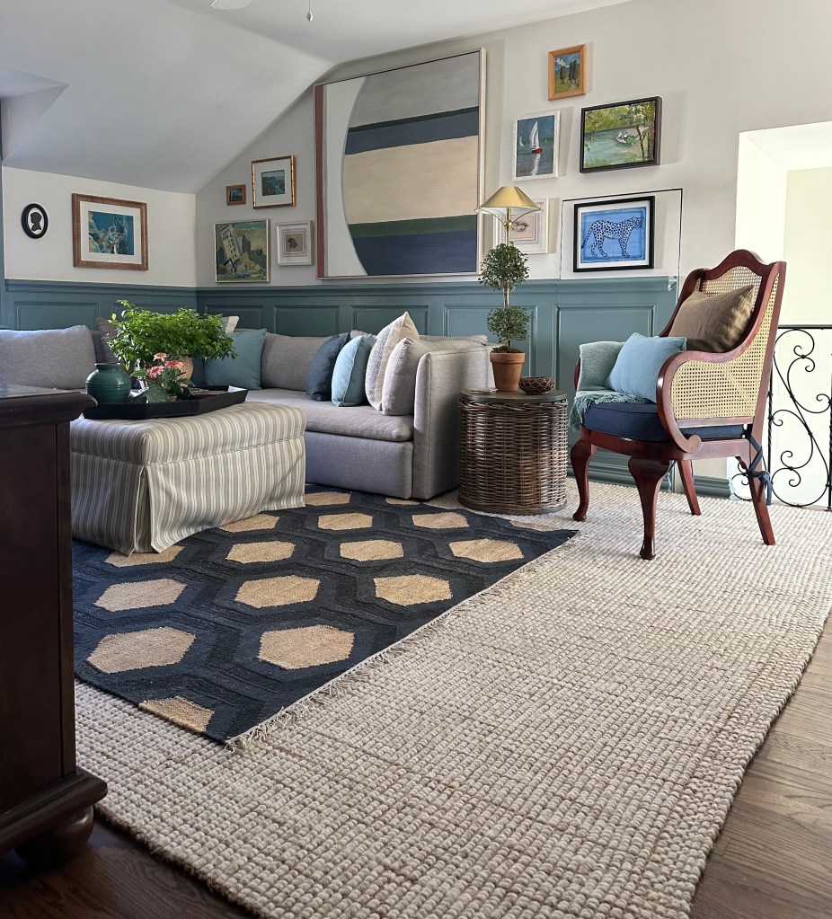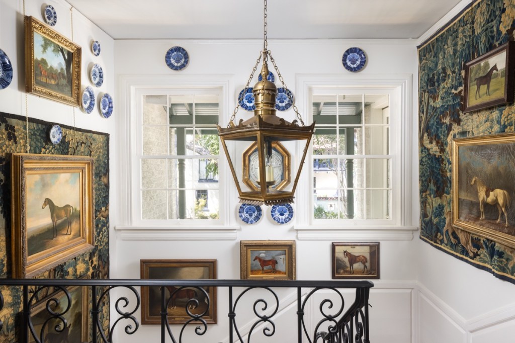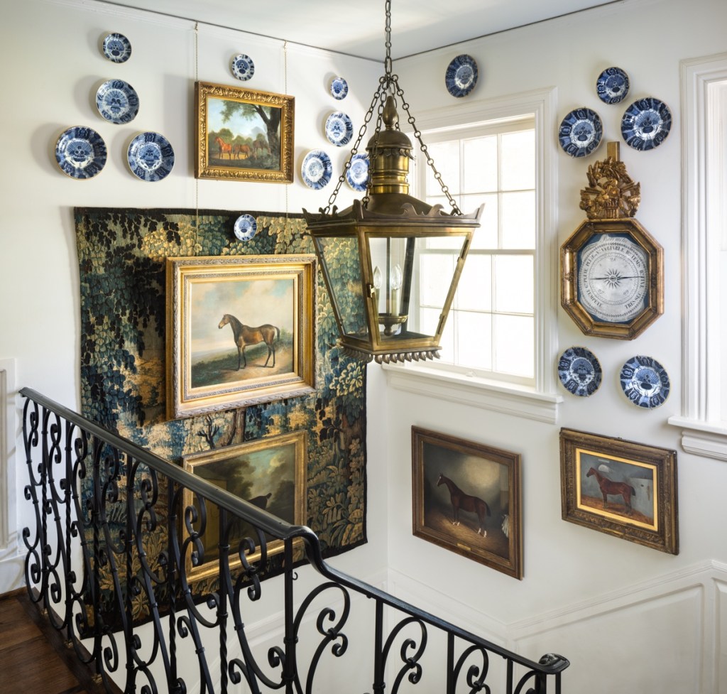 - The collection of English Equestrian oil paintings were found overtime and Pickering House Interiors orchestrated the layering of the paintings over the antique tapestries. The original picture rail moldings were used with brass hooks and chains to install the oil paintings.