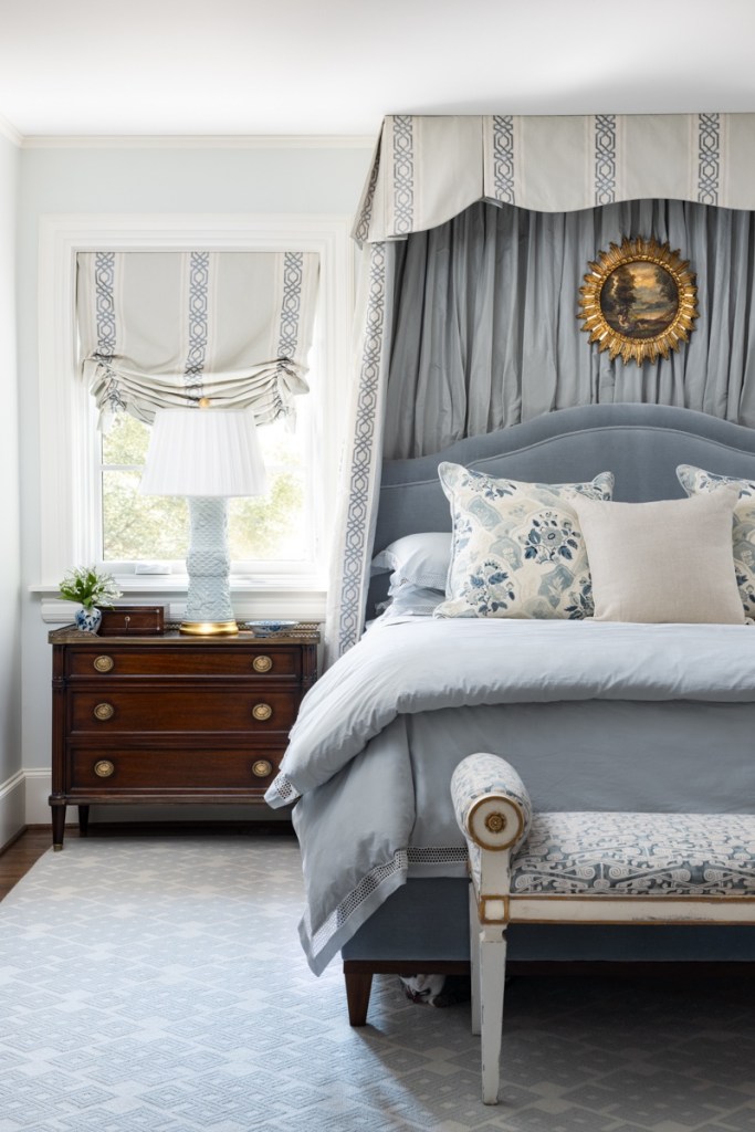 - The Swedish bench at the end of the bed was sourced by Pickering House Interiors and reupholstered in fortuny fabric.