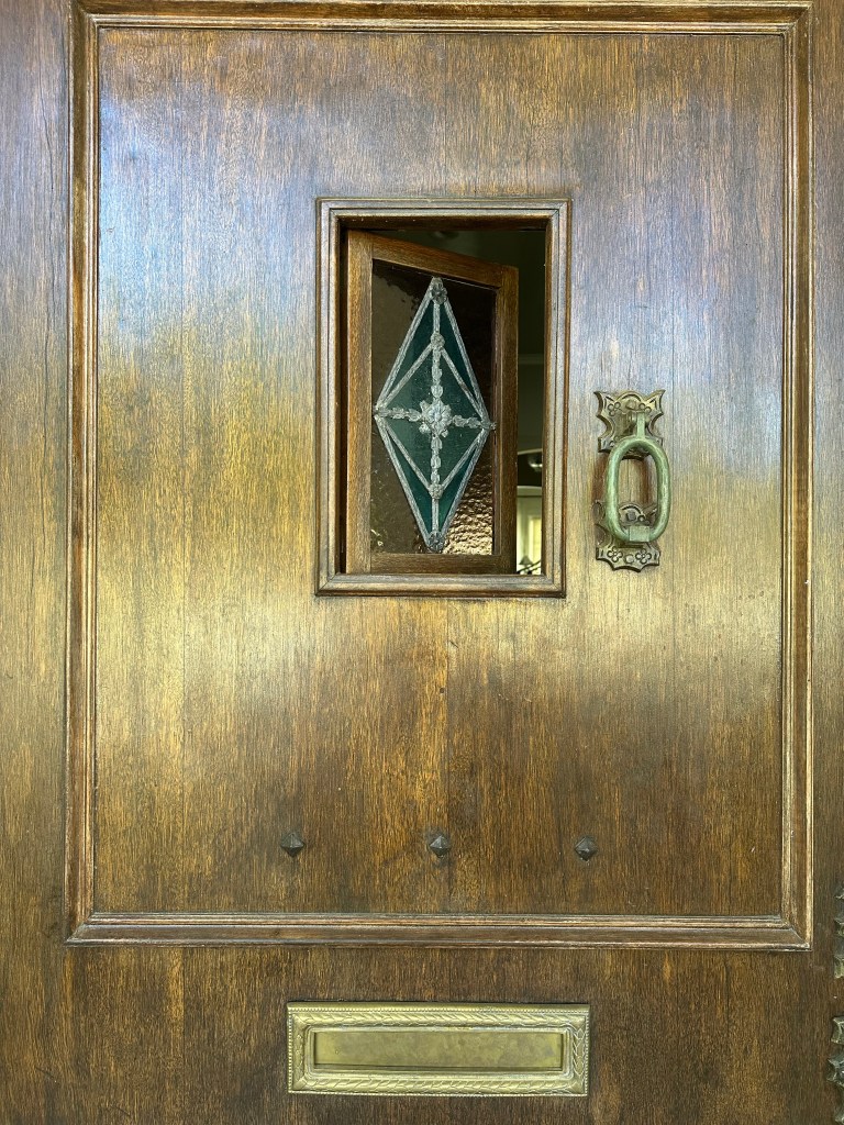 The front door is original but was refinished during the renovation. The original small stained glass window can be opened to peek out at visitors or check for packages. The stained glass was recently restored to repair a small crack.