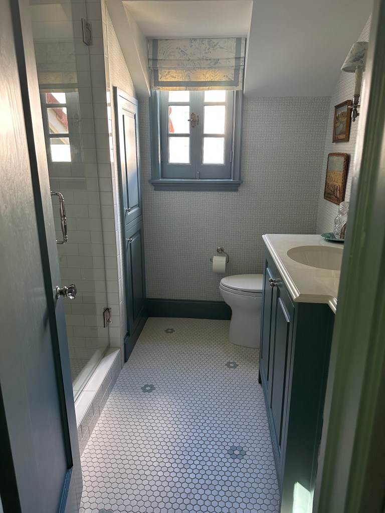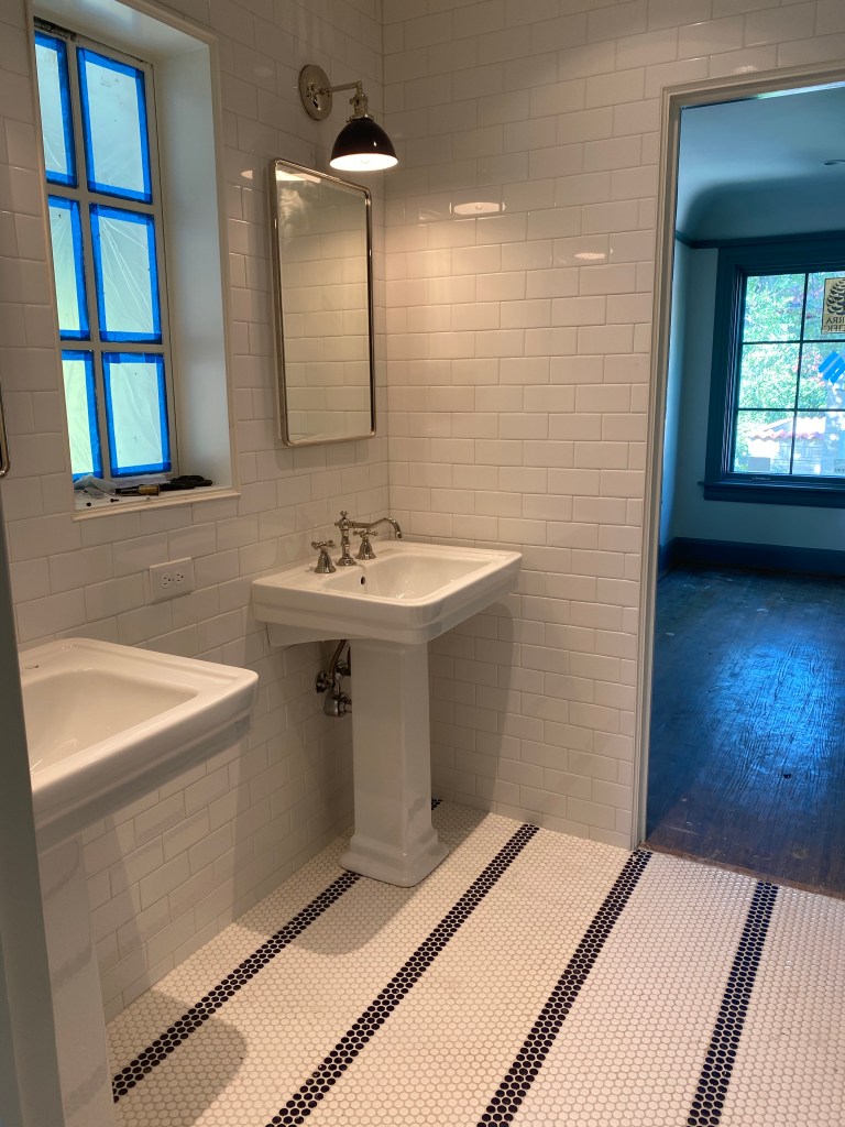 The small shared bathroom was reconfigured during the renovation to create better flow and functionality. Two pedestal sinks were added and a small closet space was repurposed for a toilet nook. The shower remains in the same spot. This was the only bathroom in the home with original 1930s ceramic tile. Unfortunately, a lot of the tile had to be removed as part of the bathroom renovation. It would have been difficult to try to repair and/or match the original colors and we wanted tile to go all the way up the wall for aesthetics and simplicity in cleaning a bathroom for two young boys. The hard choice was made to replace the original green and yellow tile with simple white subway tiles. The new blue and white penny floor tiles pay homage to the original penny floor tile.