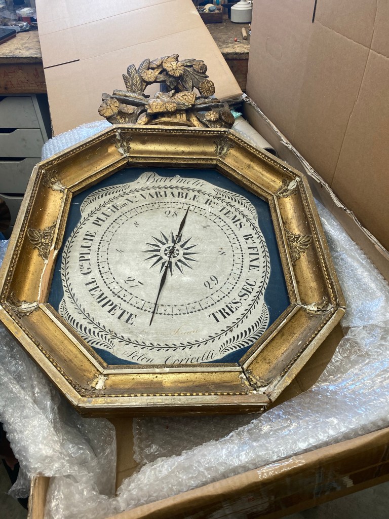 - The gilded barometer was purchased via an auction house out of The Netherlands. There are photos online showing the barometer in the entry hall of a large home in the Sint Odilienberg, Netherlands countryside, the Frymerson estate. Unfortunately, it did not fare well during shipping and had to be restored by a clock/barometer craftsman outside of Austin. He also carefully removed the original mercury tube for safety purposes.