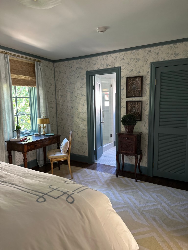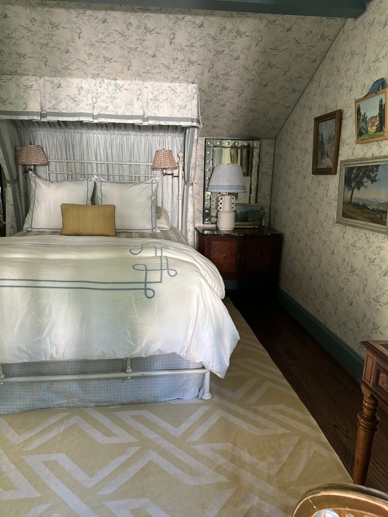 - The wallpaper selections found in the bedroom and bath were selected by Pickering House Interiors. They are actually fabric reinforced for wallpaper installation with custom ribbon trim.