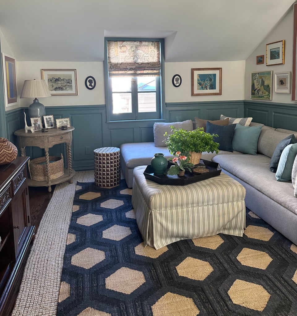 The diamond trim design at the ends of the kitchen island was inspired by door details found at the La Miranda hotel during a trip to Avignon. The same trim detail is also on the primary suite bedroom door.