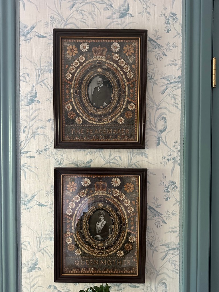 - The two royal portraits of King Edward II and Queen Alexandra are made from seeds and were gifted to the king and queen during their trip to Africa. They were originally in the royal residence, Sandringham House, outside of Norfolk, England. The portraits were passed down to a Mrs. Pinka after her family inherited the portraits from a distant relative in the early 1900s. The relative had been a security guard stationed at Sandringham estate. He was gifted the seed portraits by the Queen one year during their annual staff Christmas Party. A 1964 clipping from the Dallas Morning News has a photo of the seed portraits and more details about the Pinkas’ family trip to England to visit their family in Snettisham. The photo and article are on the small antique desk.