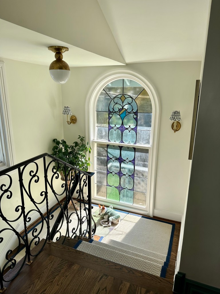 - The large stained glass window in the stair hall was found at an estate sale at another home on Lakewood Boulevard. It was restored by Barringer Custom Homes and reinforced with steel framing for installation.